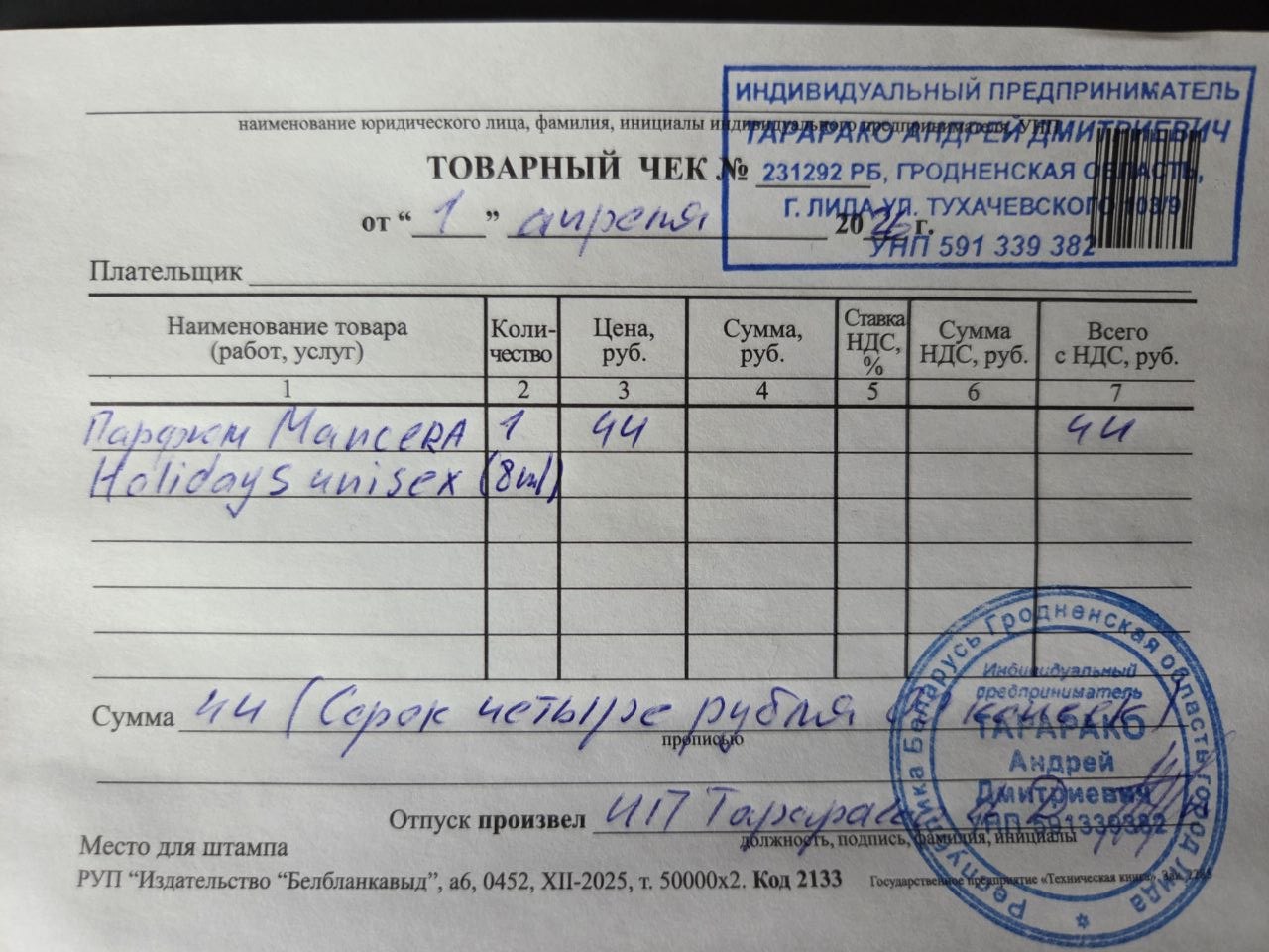 Согласно законодательству Республики Беларусь, парфюмерно-косметические товары надлежащего качества возврату и обмену не подлежат. Однако если товар был поврежден при доставке или не соответствует заявленному — мы обязательно решим эту ситуацию в вашу пользу. Свяжитесь с нами в течение 24 часов после получения заказа.